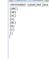 {}public class subset_test { static String[] member = new String[] { "A", "B", "C" }; static boolean[] visited = new boolean[3]; public static void main(String[] args) { subset(0); } // 순열 cnt 는 현재 몇명을 뽑았는지를 뜻한다 private static void subset(int cnt) { // 2명의 주번이 모두 뽑혔으니까 배열을 출력하고 return if (cnt == 3) { System.out.print("{"); for(int i=0;i<3;i++) { if(visited[i]) { System.out.print(member[i]); } } System.out.print("}"); System.out.println(); return; } // 대상 집합을 순회하며 문자를 하나 선택한다. visited[cnt]=true; subset(cnt+1); visited[cnt]=false; subset(cnt+1); } }