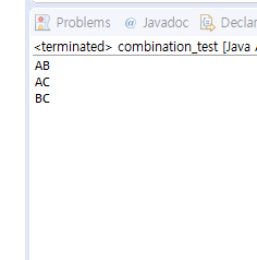 주번 주번 A B A C B C public class combination_test { static String[] member = new String[] { "A", "B", "C" }; static String [] answer =new String[2]; public static void main(String[] args) { combination(0,0); } // cnt 는 현재 몇명을 뽑았는지를 뜻한다 private static void combination(int cnt ,int start) { // 2명의 주번이 모두 뽑혔으니까 배열을 출력하고 return if (cnt == 2) { for(int i=0;i<2;i++) { System.out.print(answer[i]); } System.out.println(); return; } // 대상 집합을 순회하며 문자를 하나 선택한다. for (int i = start; i < 3; i++) { // 이미 answer 에 뽑혀있을경우에는 continue; answer[cnt]=member[i]; // answer 에 값을 추가 combination(cnt + 1 , i+1); // 한명을 뽑은것임으로 cnt +1 와 i+1을해주고 재귀호출 } } }