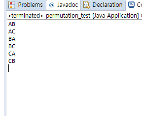 반장 부반장 A B A C B A B C C A C B public class permutation_test { // 반장과 부반장을뽑는 프로그램 // 선택하고자 하는 대상 집합. static String[] member = new String[] { "A", "B", "C" }; static boolean[] visited = new boolean[3]; //뽑았는지 안뽑았는지 확인하는 boolean static String [] answer =new String[2]; public static void main(String[] args) { permutation(0); } // 순열 cnt 는 현재 몇명을 뽑았는지를 뜻한다 private static void permutation(int cnt) { // 2명 즉 반장과 부반장이 모두 뽑혔으니까 배열을 출력하고 return if (cnt == 2) { for(int i=0;i<2;i++) { System.out.print(answer[i]); } System.out.println(); return; } // 대상 집합을 순회하며 문자를 하나 선택한다. for (int i = 0; i < 3; i++) { // 이미 answer 에 뽑혀있을경우에는 continue; if (visited[i]) { continue; } // 선택하지 않은경우, 선택했다는 표시를 해준다. visited[i] = true; //뽑은경우 answer[cnt]=member[i]; // answer 에 값을 추가 permutation(cnt + 1); // 한명을 뽑은것임으로 cnt +1 을해주고 재귀호출 // 선택을 해제한다. visited[i] = false; // 안뽑은경우 } } }